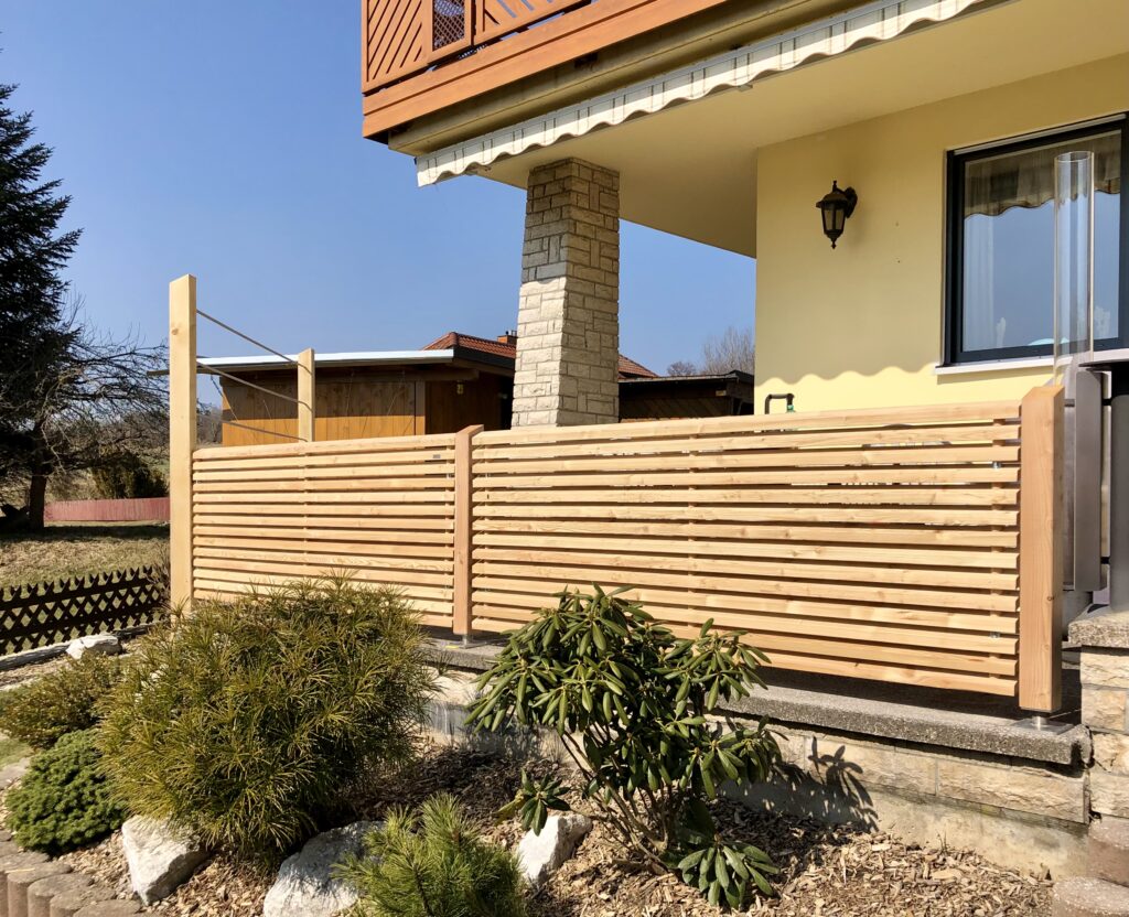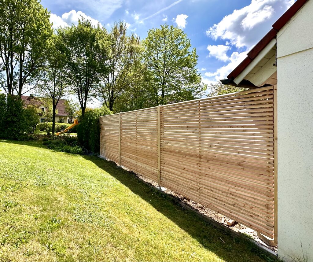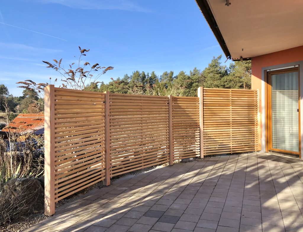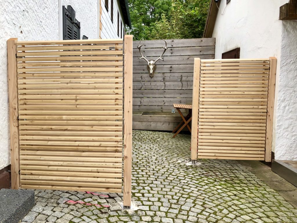 Für unseren Sichtschutz kommen ausschließlich witterungsbeständige, harzhaltige Holzsorten in hohen Qualitätsstufen sowie gestrahlte, rostfreie Edelmetalle zum Einsatz.
